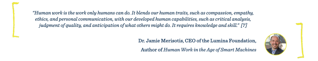 - Merisotis, J. P. (2020). The Work Only Humans Can Do. In Human Work in the Age of Smart Machines (pp. 31–32, 53). RosettaBooks.