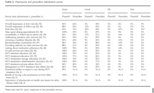 - Compared to prescribers, pharmacists had higher patient satisfaction scores in areas including overall impression at initial and subsequent visits, time spent during appointment, accessibility or follow-up by phone and education on disease state and medications. Other improved patient satisfaction areas are listed in the tables below.