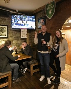 Today the Butler Bulldogs played their big rival, Xavier, at home. Another Butler student and I were bummed not to be in Hinkle Fieldhouse Saturday afternoon. However, after a little online research and recommendations from a friend, we found a sports bar in Cork that sometimes streams American sports. We knew it was a long shot, but after putting my Butler t-shirt, a group of us went over to the Woodshed Baa & Grill to see if they would be able to play the Butler/Xavier game. When we arrived, there were tons of TV’s that were all playing football (aka soccer) and rugby games. We waited until one of the games ended and asked if they would be able to play the game. They said they would “look into it,” but ten minutes went by and I decided to inquire again. When I asked for the Butler game, the guy went “OH! This whole time I was looking for the Bucknell game.” So within a few minutes they were able to put on the game. We were ecstatic! The video quality was questionable, but anything was better than nothing. We all ordered beers and cheered on the dawgs who managed a clutch win over Xavier! 🙂 Nothing like being 4,000 miles away and still getting to see the Dawgs win!